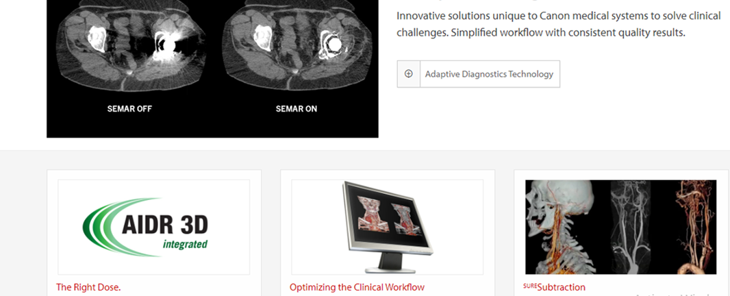 Giảm liều lượng thế hệ thứ 4 của Canon, AIDR 3D nâng cao, mang lại chất lượng hình ảnh vượt trội. AIDR 3D nâng cao đơn giản hóa việc giảm liều bằng cách nhắm mục tiêu thích ứng nhiễu trong dữ liệu thô và không gian dữ liệu hình ảnh. Mức độ giảm tiếng ồn được tối ưu hóa cho nhiệm vụ lâm sàng và được cá nhân hóa cho từng bệnh nhân.