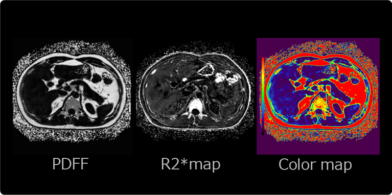Định lượng phân số chất béo là phương pháp DIXON 6 điểm độc quyền của chúng tôi, không chỉ cho phép chụp ảnh toàn bộ gan chỉ với một lần nín thở mà còn cho phép tạo ra các hình ảnh giá trị định lượng bản đồ R2* và PDFF ổn định.